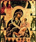 Совозсия́ днесь Све́ту Воскресе́ния свет чи́стыя ико́ны Твоея́,/ обоя́ ве́село торжеству́юще вопие́м:// сохрани́ раб Твои́х благода́тию, Влады́чице.