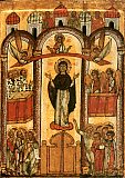 Перевод: Сегодня Дева предстоит в храме и с сонмами святых невидимо за нас молится Богу. Ангелы со архиереями поклоняются, Апостолы же со пророками ликуют: ибо за нас молит Богородица Предвечного Бога.