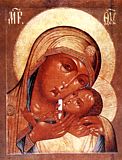 Вид этой небольшой иконы, написанной масляными красками на холсте, наклеенном на доску, производит сильное впечатление. Владычица и Богомладенец изображены только по верхнюю часть груди. Богоматерь со скорбными очами на лице прижимает к ланите Своей Младенца Христа, придерживая голову Его обеими руками. Прильнув к Пречистой, Младенец левой рукой схватился за плат, покрывающий главу Приснодевы, в правой Он держит свиток.