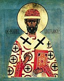 Во успе́нии твое́м обрето́ша на телеси́ твое́м сокро́вище некра́домое:/ два креста́ и тяжча́йшая желе́за, е́же есть вери́ги,/ посто́м и моли́твами Бо́гу угоди́л еси́, святи́телю Фили́ппе,// моли́ Христа́ Бо́га о всех нас.