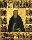 От ю́ности, преподо́бне, крест твой взе́м, Христу́ после́довал еси́,/ в моли́твах и поще́ниих, во бде́ниих же и злострада́ниих пло́ть твою́ изнуря́я./ Те́мже и Всеви́дящее О́ко твоя́ труды́ ви́дев,/ чудесы́ тя прославля́ет, и всех зва́ти тебе науча́ет:// ра́дуйся, преподо́бне о́тче Дими́трие, по́стников удобре́ние.