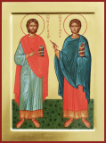 Му́ченик дво́ица единонра́вная,/ Маркиа́н с Марти́рием сла́вным, А́риево нече́стие разруши́ша/ и Соприсносу́щна Сы́на Отцу́ и Ду́хови ве́ровати научи́ша,/ Па́влу повину́ющеся и́стинных повеле́ний учи́телю,/ те́мже мече́м убие́ни, умро́ша;/ и при́сно со Христо́м живу́ще,/ о нас Того́ мо́лят// спасти́ ду́ши на́ша.
